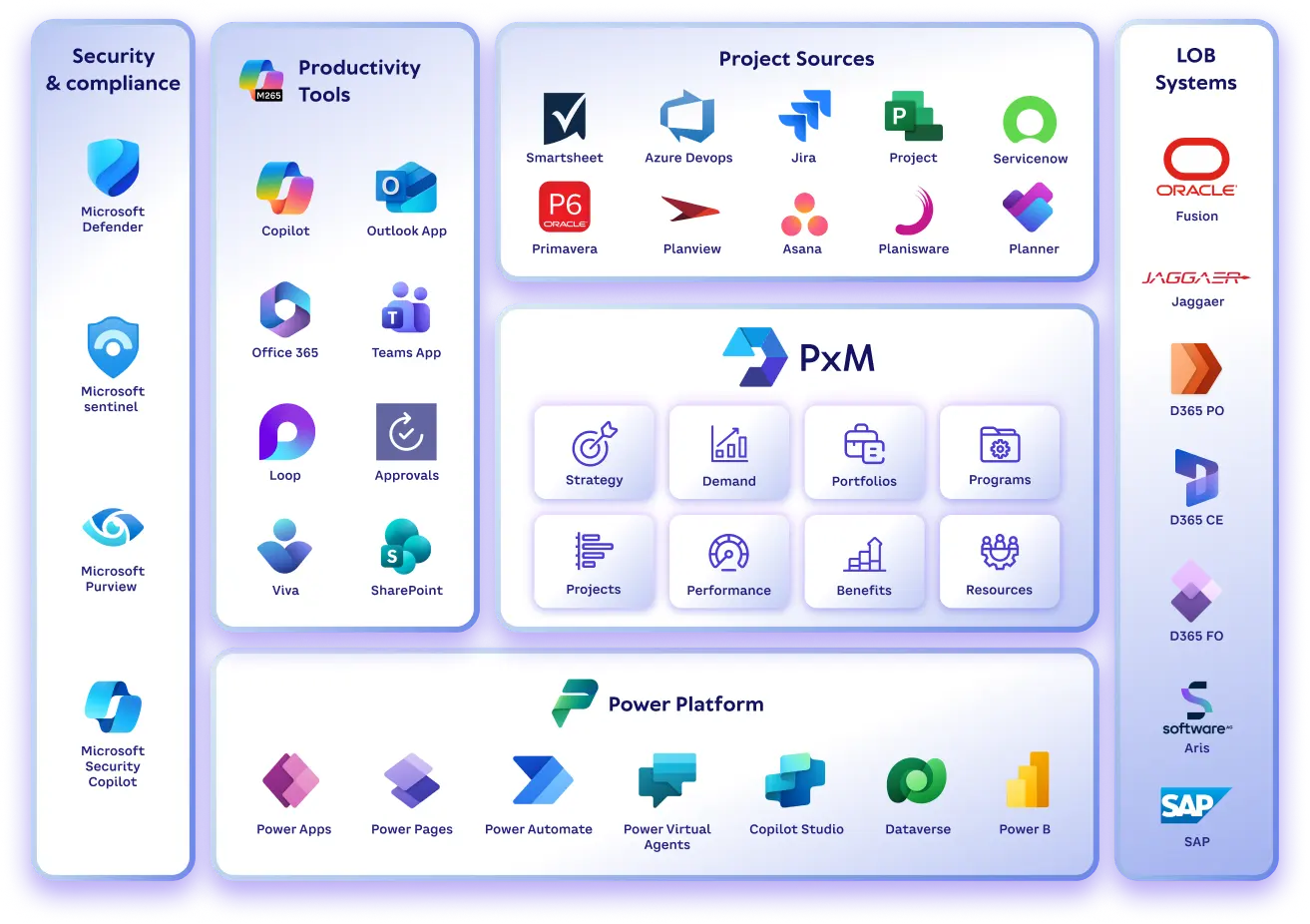 PxM is the “enterprise integration engine” that unifies your entire organizational landscape – connecting people, systems, data, and workflows into one intelligent, secure, and fully integrated platform. Built natively on the Microsoft Power Platform and extended through deep integrations with Microsoft 365, Dynamics 365, project delivery tools, and line-of-business systems, PxM becomes the core connected platform sitting at the center of your organization’s ecosystem.