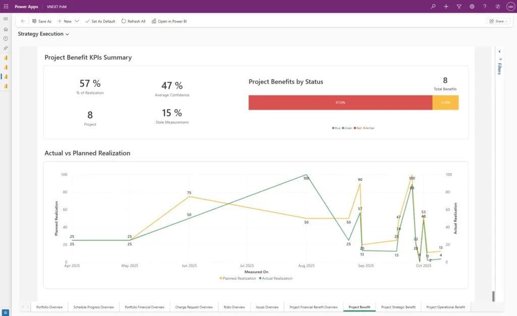 PxM automates benefit tracking: based on each benefit’s start date and reporting frequency, the system notifies benefit owners to input actual results. Dashboards visualize planned versus actual realization trends, enabling leadership to monitor performance, validate assumptions, and intervene early when benefits deviate from expectations. By maintaining clear linkage between business cases, execution performance, and realized value, PxM provides an end-to-end framework that ensures strategic initiatives deliver measurable outcomes.