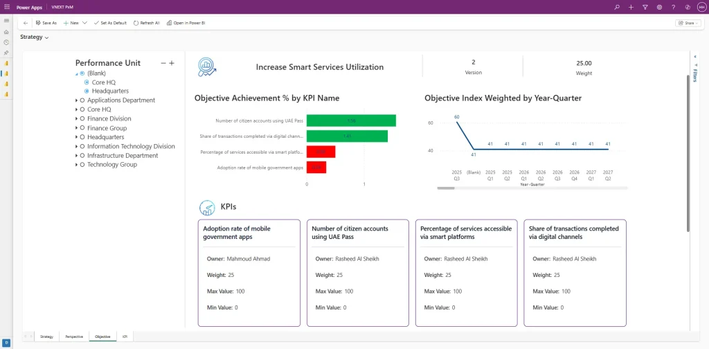 With KPI baselines, targets, and frequencies already defined; PxM then automates the collection and update cycles, prompting owners to submit actuals based on the defined reporting cadence. Power BI dashboards provide real-time visualization of performance trends, variances, and achievement levels, enabling leaders to quickly identify gaps, emerging risks, and areas requiring intervention. Fully integrated with the Strategy, Portfolio, Project, and Benefits modules, Performance Management ensures that every investment is monitored against the outcomes it was designed to achieve.